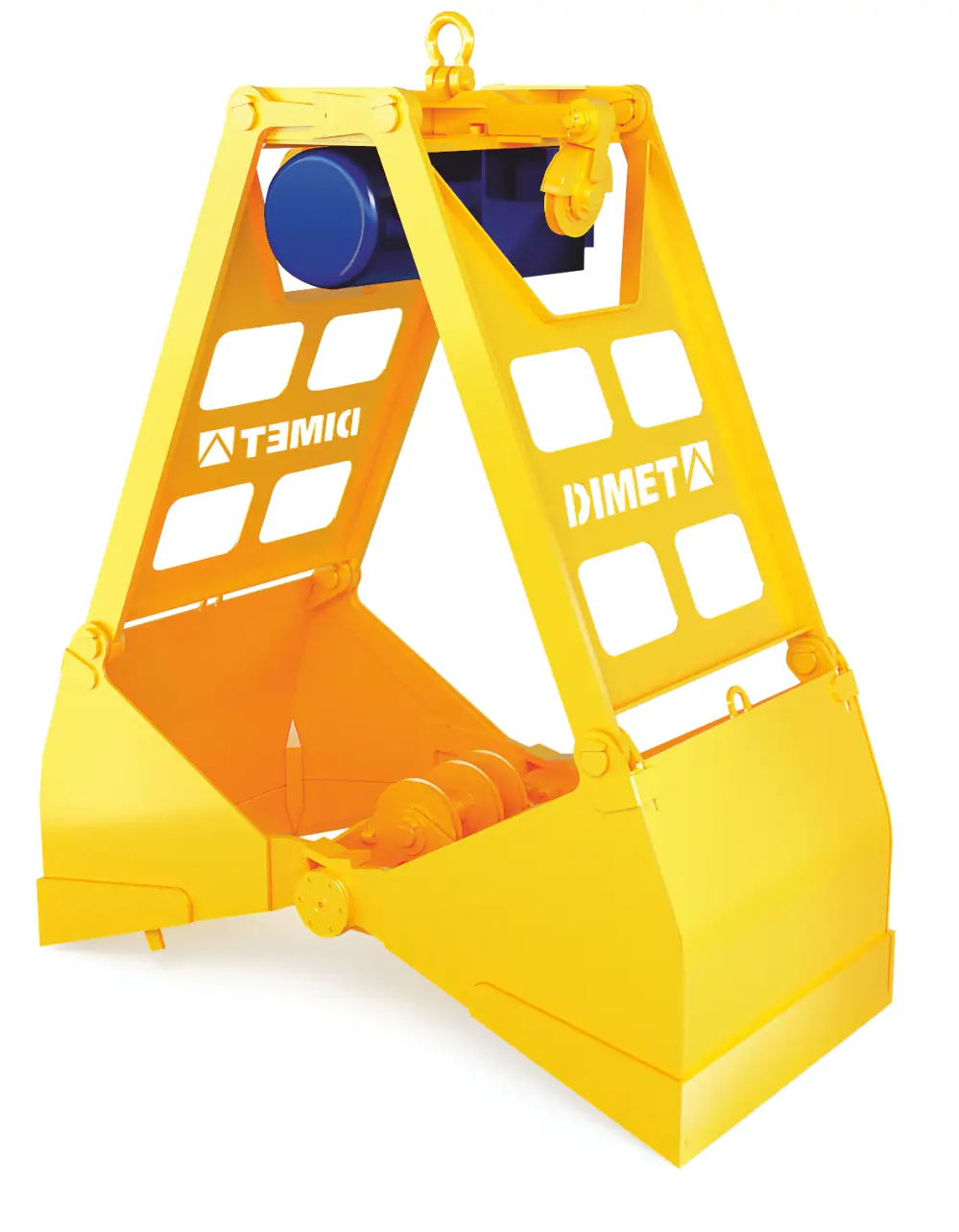 Грейферы моторные двухчелюстные (талевые) DIMET в качестве привода челюстей оснащаются талью специальной компановки. Для надёжной работы в конструкцию тали встроен ограничитель грузоподъёмности, канатоукладчик, концевые выключатели. Возможно изготовление челюстей различного типа: открытые, полузакрытые, закрытые.