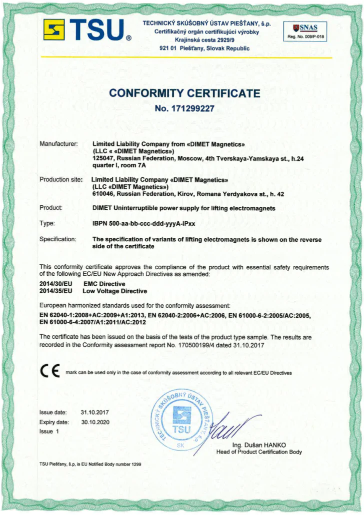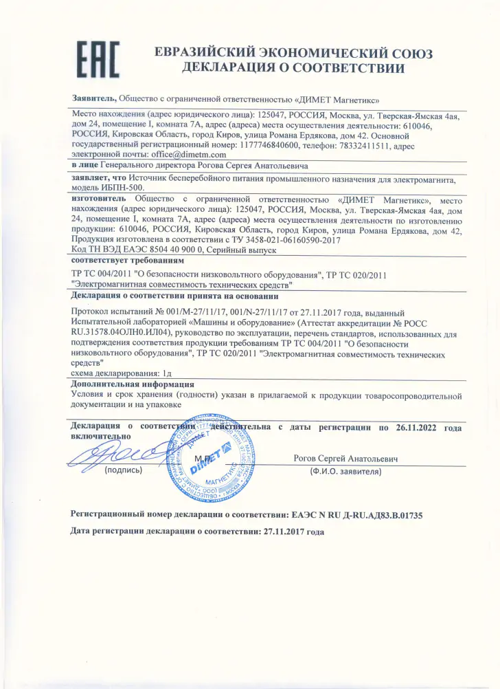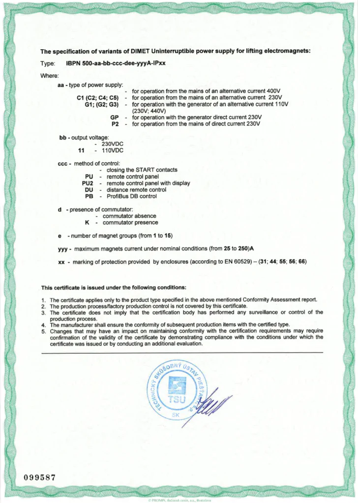 Источник резервного питания электромагнитов DIMET ИБПН - 500 при пропадании электроэнергии.