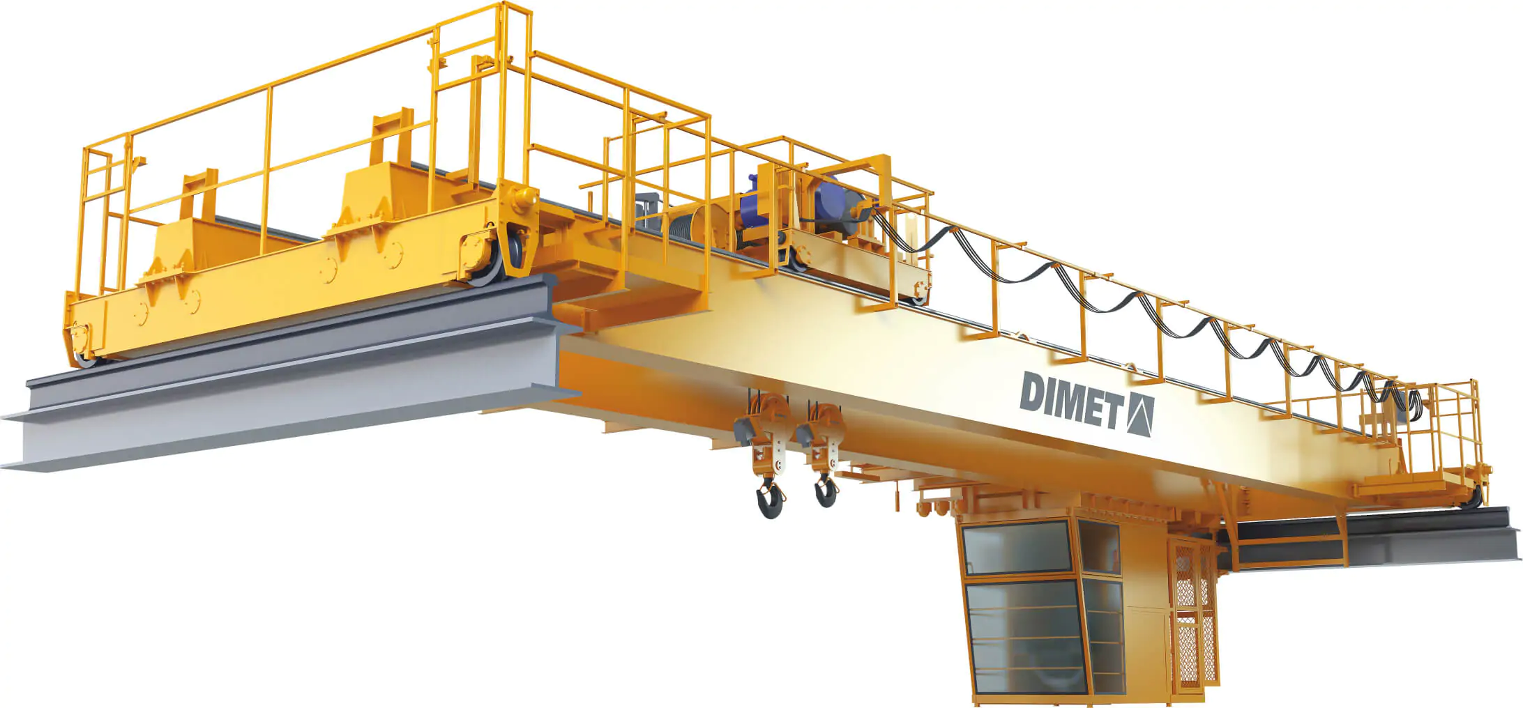 Краны мостовые двухбалочные DIMET с управлением из кабины (со вспомогательным подъемом) спроектированы исходя из грузоподъемности до 250 тонн. Однако практика показывает, что до 75% операций осуществляются с грузами значительно меньшей массы. Для повышения экономической эффективности использования подъемного оборудования мы предлагаем краны, оснащенные вспомогательным механизмом подъема меньшей грузоподъемности, при этом скорость вспомогательного подъема может быть до пяти раз выше скорости основного подъема.