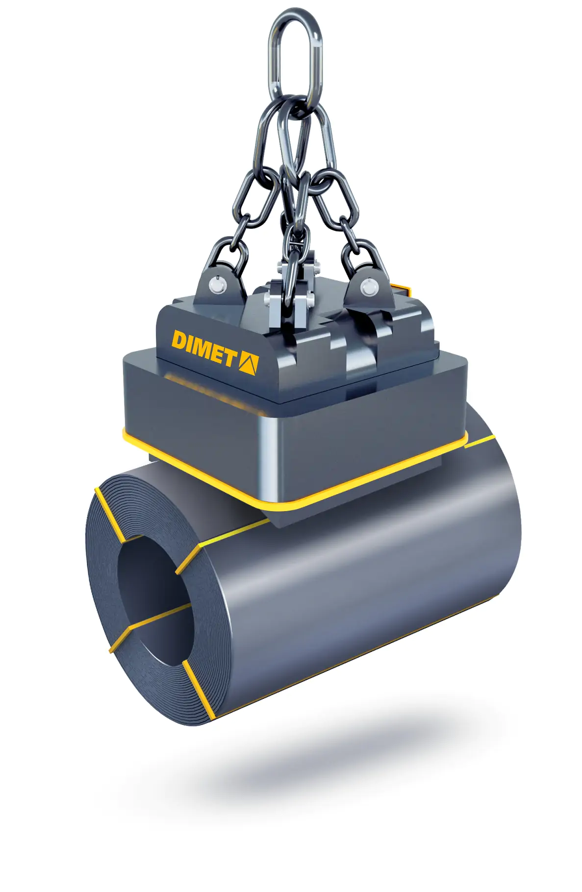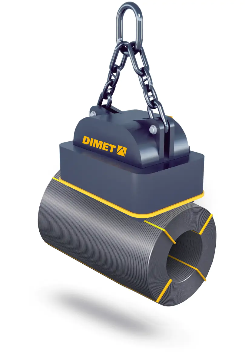 Специальная серия электромагнитов DIMET ЭМГБ для перегрузки листовой стали в рулонах, бухт катанки в горизонтальной плоскости. Конструкция магнитопровода, рассчитанная с учетом особенностей транспортируемого груза, и позволяет получить максимальную грузоподъёмность при минимальной массе магнита. В конструкции имеются специальные полюсные накладки для увеличения площади контакта с грузом. Данное решение способствует увеличению производительности при работе с электромагнитами серии ЭМГБ.