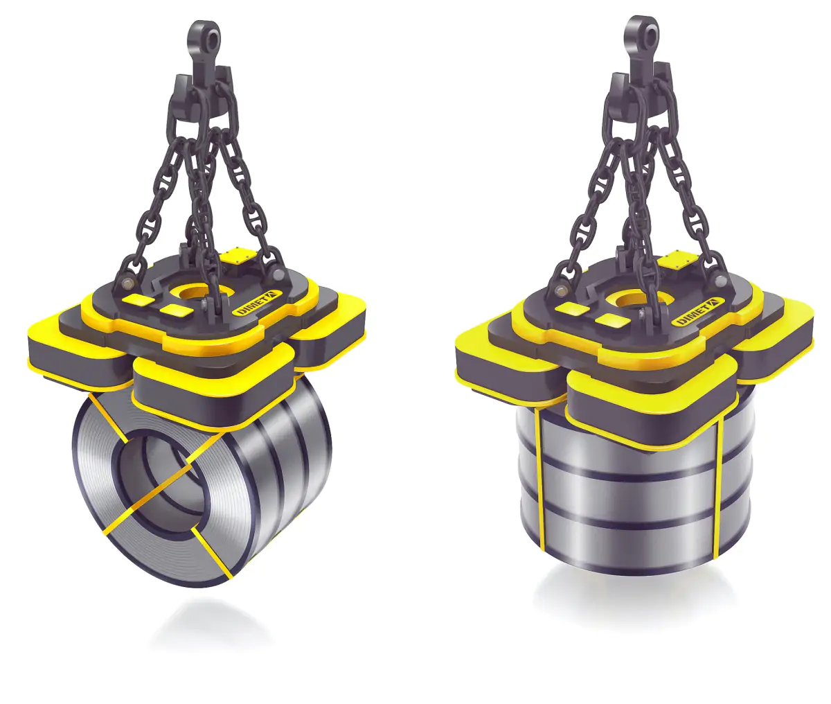 Специальная серия электромагнитов DIMET ЭМГУ для перегрузки листовой стали в рулонах в вертикальной и горизонтальной плоскостях. Конструкция магнитопровода, рассчитанная с учетом особенностей транспортируемого груза, и позволяет получить максимальную грузоподъёмность при минимальной массе магнита.